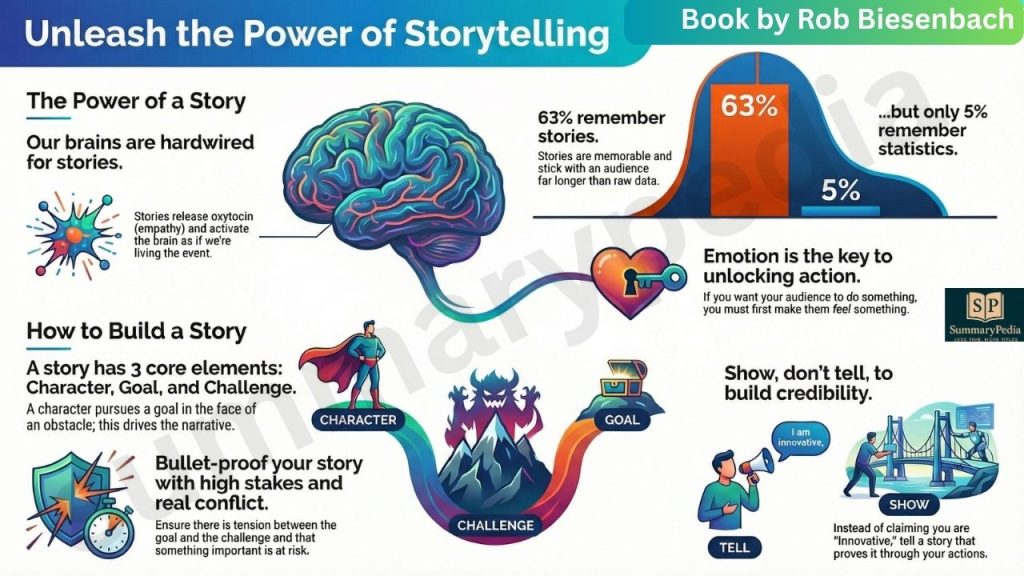 In Unleash the Power of Storytelling, Rob Biesenbach bridges the gap between the corporate world and the world of performance. He argues that because our brains are hardwired for narrative, stories are the “signal” that cuts through modern noise. By using a simple three-part structure—character, goal, and challenge—anyone can transform dry data into an emotional experience that sticks. Biesenbach provides a toolkit for finding, focusing, and delivering stories, whether for a high-stakes presentation, a job interview, or a personal brand. The emotional takeaway is clear: by being vulnerable and authentic, you create a human connection that data points simply cannot replicate.